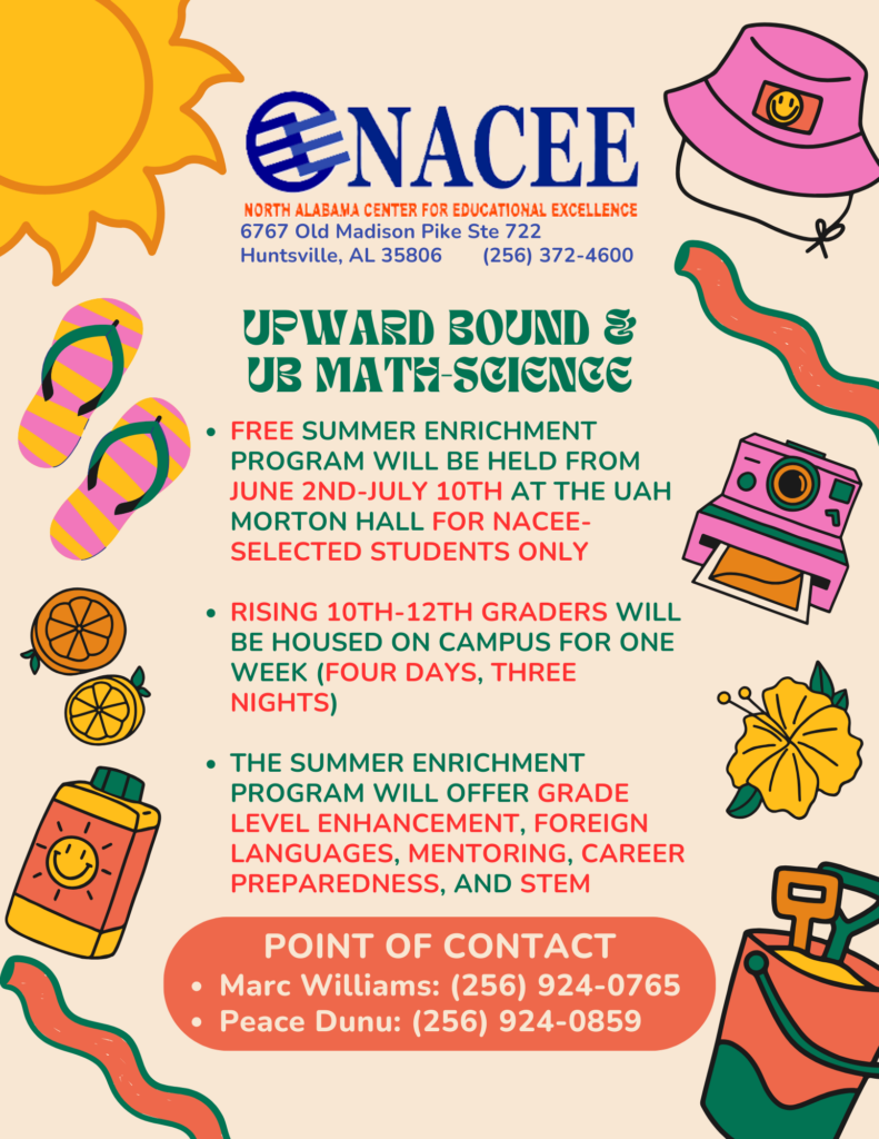 The Upward Bound Program (UB) serves 67 students in Huntsville City Schools - Columbia High School, Lee High School, and Jemison High School. It is designed to generate the skills and motivation necessary to persist in completing a program of secondary and postsecondary education. UB has a twelve-month comprehensive program that is divided into three separate components: Academic Year Component, Intensive Six-week Summer Component, and the Bridge Component. The Academic Component includes counseling, daily after-school tutoring, and a weekend program that meets for scheduled Saturday sessions. Students are required to enroll in college prep courses by their sophomore year. All participants are provided supplemental instruction, tutoring, and activities to ensure completion of secondary education. The Summer Component offers academic enrichment, personal development, and cultural awareness. It is hosted by the University of Alabama in Huntsville. The Summer Component offers college preparatory courses, electives, academic, career and personal counseling, recreational activities, and field trips. The Bridge Component is to ensure that participating graduates have the transitional experience between high school and college. Based upon individualized student programs developed as a result of student profiles, students enroll in four to six hours of transferable courses (Mathematics and English) offered by UAH. UB serves high school students from low-income families, and also high school students from families in which neither parent holds a bachelor’s degree.